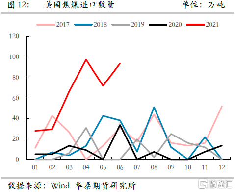 下半年雖然國內執行減產,但是海外鋼材供需依舊旺盛,據華泰期貨研究院測算,全年海外粗鋼產量同比增加11466萬噸,增幅達14.8%,粗鋼消費同比增加15000萬噸,增速達19%,生鐵產量產量同比增加5846,增速達11.6%,由此也必然導致焦煤需求的增加,上半年海外焦煤價格高企也已反應了這一現實問題,下半年預計海外焦煤價格將繼續維持強勢,料想也將在一定程度上支撐國內焦煤價格。