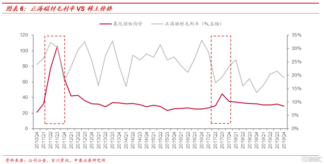 這是因爲,磁材價格一般按照前一月稀土原料成本和毛利率水平覈定售價,並且採用月度或者季度調價的模式,即釹鐵硼價格變動略滯後於稀土價格一個季度左右時間,且受益於低價稀土原材料庫存的影響,磁材企業在稀土價格上行週期,毛利率同樣會放大(例如正海磁材2011年和2017年Q2-Q3毛利率變動)。