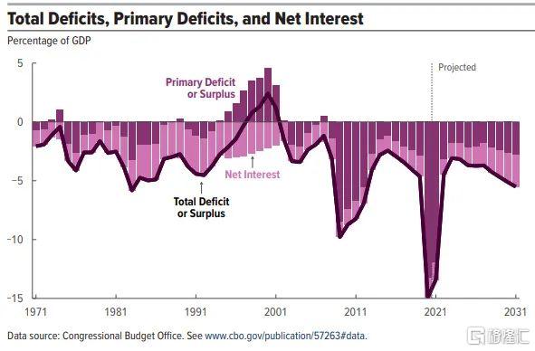 按照美國國會預算辦公室的數據,未來十年即使沒有經濟衰退和經濟刺激,美國的財政赤字和債務都不可能改善。