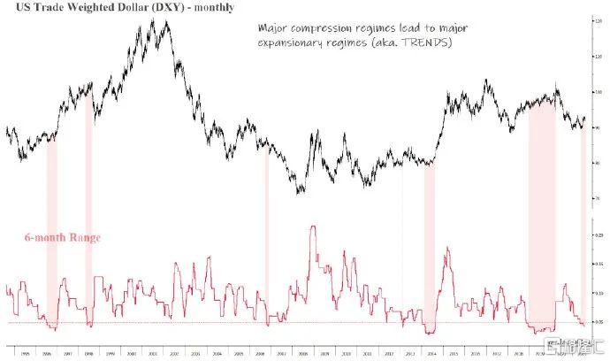 要知道美元指數過去六個月,都在窄幅波動。歷史上出現這種情況,往往可能出現單邊行情。