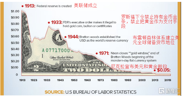 可以看出在1944年佈雷頓森林體系以後,隨着印鈔不斷增多,鈔票的實際購買力是在加速下滑的。