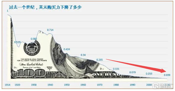 隨着債務越來越多,美元也越印越多。美元的實際購買力,自然也在不斷貶值。