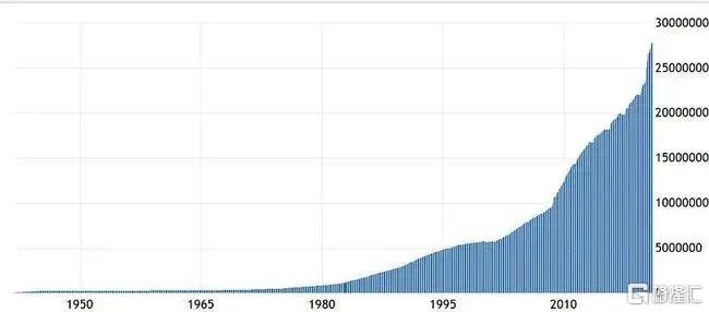 不過美國人的核動力印鈔機,並沒有因爲債務太多止步,而是加快了印鈔速度。