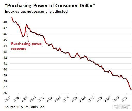 經歷了2021年前7個月的大印鈔,美元購買力7月份又下降了0.5%,換算成年率下降了8.6%。