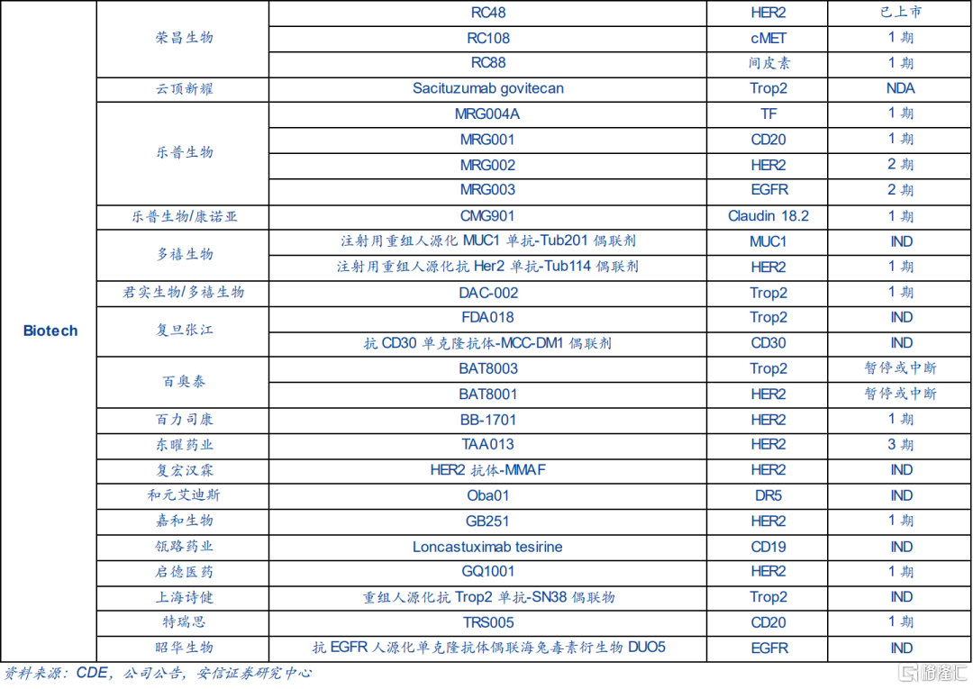 榮昌生物:10年前開始佈局ADC產品研發。今年7月14日,榮昌生物維迪西妥單抗(RC48)新適應症上市申請獲NMPA 受理,預計用於治療 HER2 過表達局部晚期或轉移性尿路上皮癌。cMET靶向ADC RC108和間皮素靶向ADC RC88均已獲批進入1期臨牀。CLDN18.2靶向ADC RC118已經開展臨牀前研究。