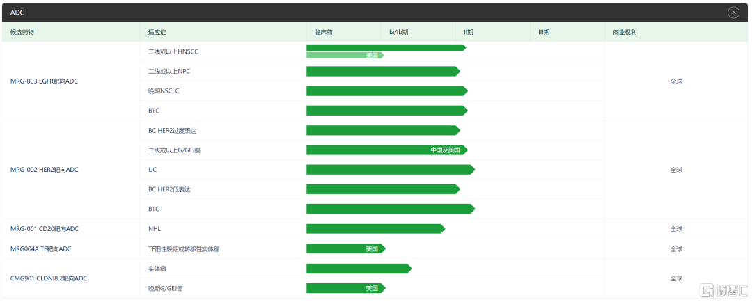 EGFR:超級靶點,在多種實體瘤中高表達,如頭頸癌、鼻咽癌和非小細胞肺癌,ADC藥物具有龐大的市場潛力。樂普生物MRG003是目前國內處於臨牀研究階段的首創和唯一靶向EGFR的ADC產品,涵蓋多個大適應症,正在開展針對複發性或轉移性晚期HNSCC、晚期NSCLC、BTC及NPC的2期臨牀試驗,準備在美國啓動複發性或轉移性晚期HNSCC臨牀研究。
