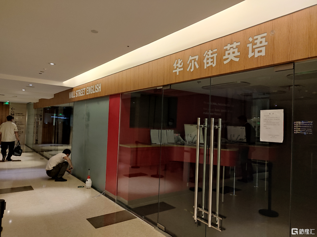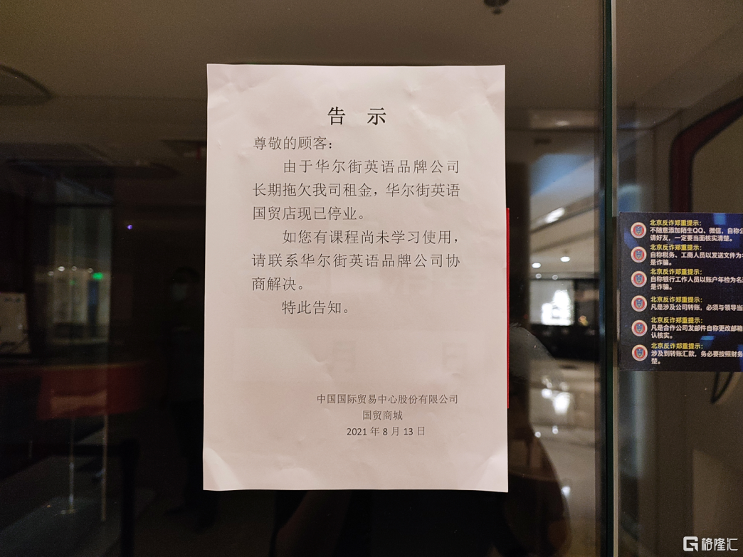 位於北京國貿商城的另一家華爾街英語門店也是相似的情形。門店大門緊鎖,有工人正在貼玻璃磨砂貼。但在玻璃門上,貼着商城方的通知:“由於華爾街英語品牌公司長期拖欠我司租金,華爾街英語國貿店現已停業。”通知日期爲8月13日。
