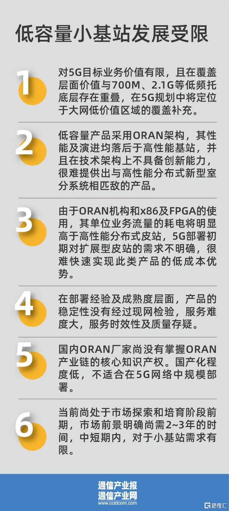 第六,在行業市場,產業鏈各個夥伴均認爲當前尚處於市場探索和培育階段前期,市場前景明確尚需2~3年的時間,中短期內,對於小基站需求有限。況且行業客戶對於網絡特性及能力的需求基本上屬於3GPP的新規範能力。ORAN產品的支持能力和進度均不如主流供應商高性能分佈式新型室分系統,競爭力有限。