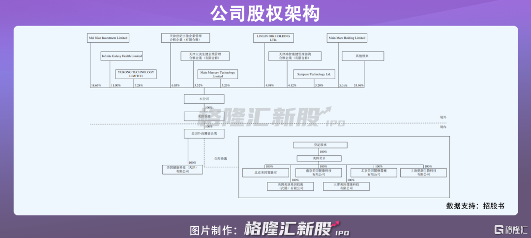 從公司的股權架構來看,經過多輪股權轉讓後,美年健康仍持有美因基因18.63%的股份,是美因基因的大股東。而公司的聯席名譽主席兼執行董事俞博士有權行使本公司已發行股份總額約22.4%的投票權,是美因基因控制表決權的唯一最大股東。