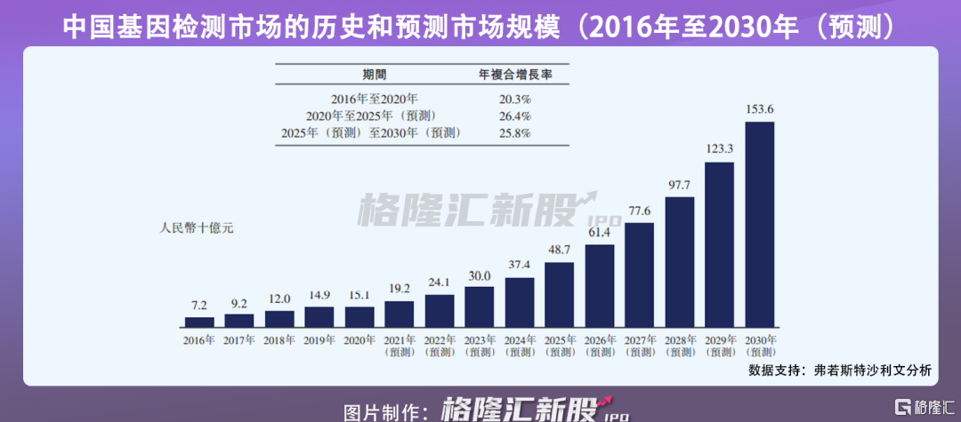 中國基因檢測市場規模於2020年達到151億元,2016至2020年的複合增長率爲20.3。並預計在2025年規模進一步增長至487億元,到2030年達1536億元。