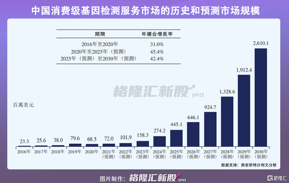 美國消費級基因檢測市場建立於1991年,在經過起步期和觀察期後,於2019年進入快速發展階段,並繼續呈現高增長態勢。而中國消費級基因檢測市場起步較晚,於2013年左右建立,目前仍處在發展的初期階段。2020年中國該市場規模約爲6850萬美元,自2016年至2020年的複合增長率爲31%。預計到2025年增長至4.5億美元,並於2030年達到26億美元。