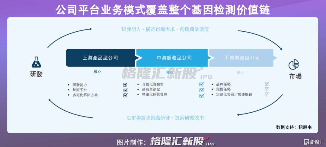 美因基因作爲中國少數具備綜合能力的基因檢測公司之一,實現了上中下遊全產業鏈覆蓋,並採用服務與產品研發和商業推廣雙輪驅動的平臺型業務模式。