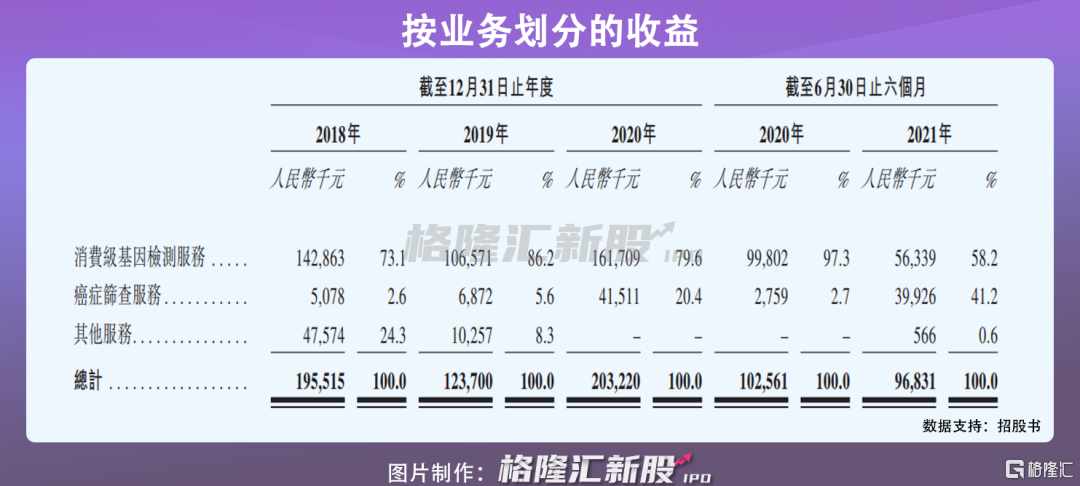 分業務來看,消費級基因檢測服務是公司的主要收入來源,連續三年佔比超70%。不過值得關注的是,癌症篩查服務從2019年5.6%的佔比一躍增至2020年的20%,而其他服務降至0。