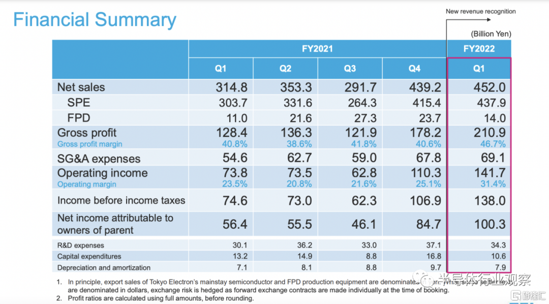 東京電子FY2022 Q1(2021年4月1日- 2021年6月30日)財報一覽(圖源:東京電子)