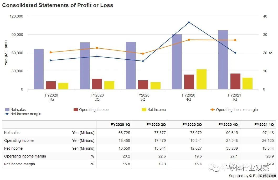 自動測試設備製造商愛德萬測試2021財年第一季度(截止6月30日的一個季度)銷售額為971.2億日元,比去年同期(667.3億日元)增長45.5%。當季營運利潤從去年同期的134.6億日圓上升94.1%至261.3億日圓。第一季度歸屬於母公司的淨利潤攀升83.4%,至193.4億日元,去年同期為105.5億日元。每股收益為97.87日圓,高於上年同期的52.89日圓。