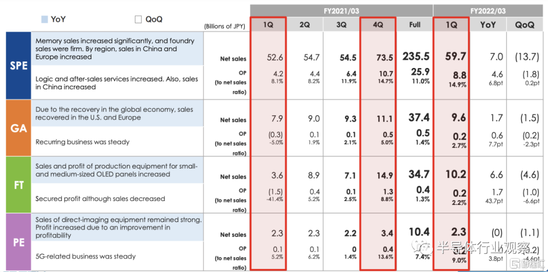 其中,半導體生產設備(SPE)業務的淨銷售額達到597.53億日元,同比增長13.4%。該板塊盈利888.88億元,同比增長107.8%;在印刷藝術設備(GA)業務的淨銷售額達到96.45億元,同比增長21.7%,盈利為2.62億日元(之前的營業虧損為3.96億日元);在FT業務中,中小型OLED生產設備的銷售和淨銷售額都有所增長,合計102.9億日元,同比增長180.5%。盈利為2.3億日元(與上一財年營業虧損15.19億日元);在PE業務方面,由於直接成像設備銷售穩定,該領域的淨銷售額保持在23.46億元,同比下降0.7%。盈利為2.11億元,同比增長70.9%。