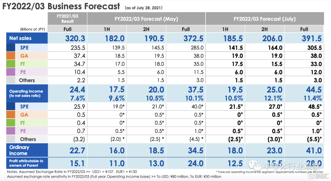 Screen Holdings於7月28日宣佈,因預估芯片廠將持續積極進行投資,因此今年度(2021年4月-2022年3月)合併營收目標自3,725億日元上修至3,915億日元(將年增22.2%)、合併純益自240億日元上修至280億日元(將年增84.6%),如下圖最右側一欄所示。