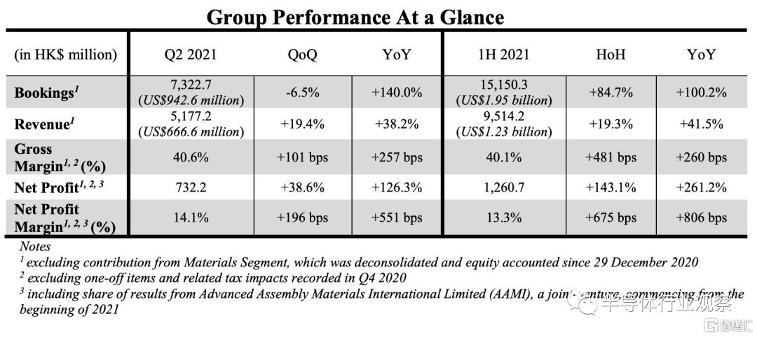 2021年上半年ASM的收入和預訂量均創紀錄,毛利率大幅提高,訂單積壓量創紀錄。在截至2021年6月30日的六個月實現收入95.1億港元(12.3億美元),較2020年前六個月的67.3億港元(8.659億美元)增長41.5%。淨利潤為12.6億港元,截至2021年6月30日,積壓訂單達115.4億港元(14.9億美元)。