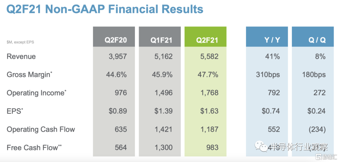 應用材料2021財年第二季度(截至2021年5月2日)的營收為 55.8億美元,第一季度的營收為51.6億美元,也就是説2021財年前兩個季度總營收為107.4億美元,比2020財年前兩季度的總營收的81.1億美元同比增長32%。“Applied Materials 創紀錄的業績得益於我們半導體業務的廣泛實力,” 應用材料總裁兼首席執行官Gary Dickerson如是説。