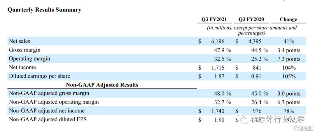 應用材料2021財年Q3的財報情況(圖源:應用材料)