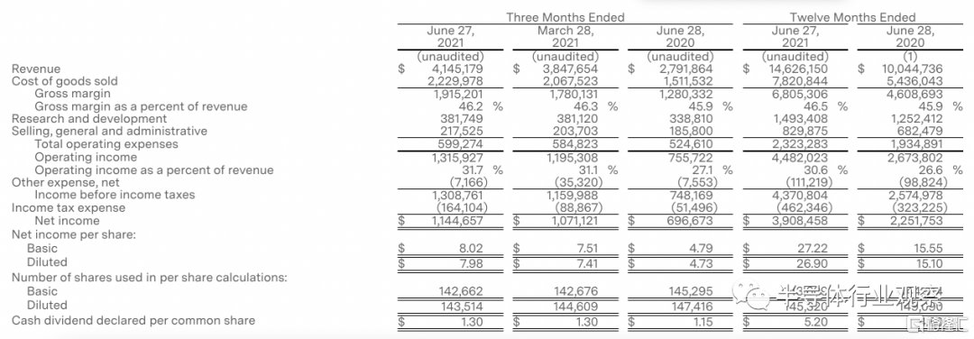 LAM Research也公佈了其截至2021年6月27日(“2021年6月季度”)的財務業績。截止6月27日,公司收入41.5億美元,非 GAAP 攤薄每股收益為 8.09 美元。2021年3月的季度營收為38.48億美元,非 GAAP 攤薄每股收益為 7.49億美元。計算可得,2021年上半年LAM Research的總營收為79.9億美元,而2020年上半年的營收為52.9億美元,同比增長了51%。