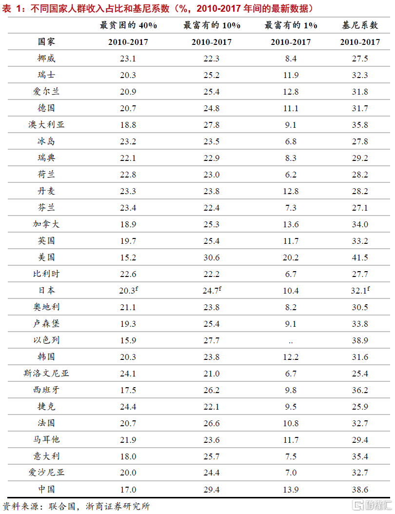 衡量貧富差距的有效指標是基尼係數,主要用於衡量一國收入分配的公平程度。根據聯合國的分類標準,基尼係數在0.2-0.29之間代表低貧富差距;0.3-0.39之間代表中等貧富差距;0.4以上意味着高貧富差距。換言之,0.4也是收入分配差距的警戒線。從基尼係數來看,挪威、瑞典、丹麥、芬蘭、冰島五大北歐國家是全球貧富差距控制當之無愧的領頭羊,基尼係數均位於0.3以下,屬於低貧富差距國家。發達國家中,日本、德國貧富差距同樣較爲健康,基尼係數均爲0.32,離低貧富差距的標準較近。