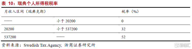 稅收領域,瑞典同樣對富人徵收重稅。瑞典的稅收總量佔GDP的比重達到42.9%,遠高於OECD平均值33.8%,在所有OECD國家中排名第四。整體稅收體系也由明顯的“劫富濟貧”特徵。瑞典的個人所得稅按累進稅率制分爲三檔,其中針對月收入大於53.7萬克朗的徵收高達52%的個人所得稅。個人所得稅佔瑞典所有稅收收入的29%,同樣遠高於OECD平均值5%。此外,瑞典也有較高的公司稅和資本利得稅,分別爲20%和30%;但瑞典不徵收遺產稅。