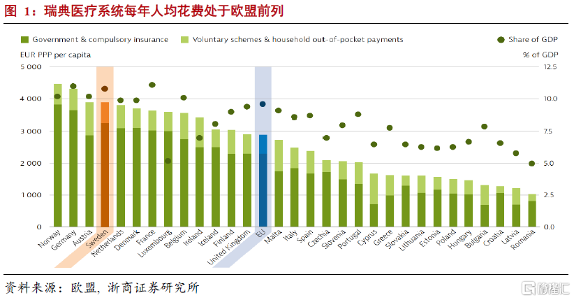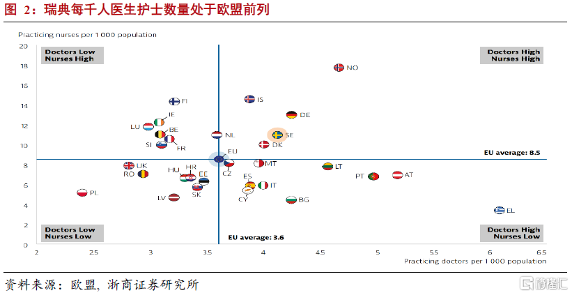 二是瑞典的醫療保險制度同樣完善。其一,瑞典的醫保覆蓋面較廣,所有瑞典公民均可參保。其次,瑞典醫保爲每年參保人的醫療支付設定閾值,處方藥的支付費用每年一旦超過2350瑞典克朗後,剩餘費用全由政府支付;每次就診病人只需支付150-400瑞典克朗的金額,年度就診費用超過1150克朗後,剩餘由政府承擔。再者,瑞典醫療體系質量較高,根據歐盟的健康報告,瑞典每千人有12個護士和約4.2個醫生,兩項指標均超過歐盟平均水平。
