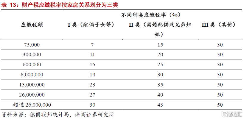 德國同樣是發達國家中貧富差距控制能力較強的代表國家。稅收方面,德國長期以來實行較高的稅率,在縮小貧富差距的過程中起到至關重要的作用。其中,個人所得稅採用累進稅制,稅率從0-45%劃分爲四檔,資本利得稅和公司稅統一按稅率25%和15%徵收。此外,德國還對遺產和財產徵以重稅。德國對遺產稅實行累進稅制,根據親屬關係和繼承的資產規模不同,稅率從7%最高到50%不等,整體秉承遺產多者多徵、關係遠者多徵的原則,即便是直系親屬,大額財產繼承最高也需繳納30%的遺產稅;房產稅則依據房產價值和當地稅率計算,稅率從0.26%到1%不等,每年進行繳納。