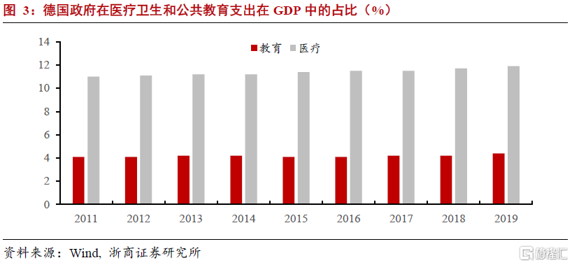 轉移支付方面,一是德國有較爲完善的醫療保險制度。德國是世界上最早建立醫療保險制度的國家,其醫療保險制度覆蓋面極爲廣泛,處於世界領先水平。整體制度以社會健康保險爲主、商業保險爲輔,其中強制性的社會健康保險制度覆蓋德國大約90%的人口。法定體系下,絕大多數的醫療費用可由保險公司支付,居民購買處方藥僅需負擔藥品費用的10%;如果全年醫療費用超過家庭總收入的2%,可以在當年剩餘時間內免除其他醫療費用。從覆蓋範圍看,德國法定醫療保險幾乎涵蓋所有醫療服務。德國政府每年在醫療衛生領域支出的GDP佔比超過11%,是歐盟最高水平。二是德國施行12年的義務教育制。早在19世紀初,德國就頒佈了《初等義務教育法》,義務教育得到切實貫徹。德國的義務教育爲12至13年,學生完成義務教育後可以在大學或職業高等學校之間自由選擇。2005年起,由聯邦憲法法院裁決取消大學免學費制度,各州根據自身情況自由裁量收取學費。完善教育體系的同時,政府也提供鉅額資金和設備用於修建學校,德國每年的公共教育經費支出佔GDP的比重維持在4%以上。三是德國對貧困家庭實行較高力度的補貼。德國1961年頒佈《聯邦社會救助法案》,實行以教育補貼和住房補貼爲主的家庭補給,德國政府每年家庭福利的支出規模佔國內生產總值的比例約爲3.3%,遠高於OECD國家的平均值2.34%。此外,德國財政還兼顧區域平衡。根據《投資資助法》,要求財力強的州拿出部分稅收收入“捐給”財力弱的州。