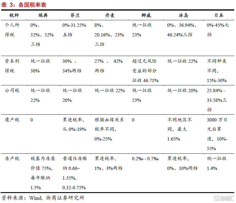 海外國家縮小貧富差距主要依賴強有力的二次分配製度,產業政策不發揮核心作用。北歐五國以及日本等貧富差距較小的國家在二次分配體系主導下均具有高稅收和高福利特徵。稅收方面,除了全球普遍的個人所得稅和公司稅外,上述國家在財產稅、資本利得稅、遺產稅等領域均有較強的徵收力度;轉移支付方面,上述國家在全民醫保、義務教育、失業福利等領域均對普通羣衆實行較大力度的補貼。
