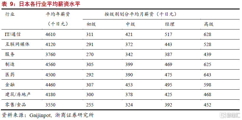 職級方面,日本IT、互聯網、製造業等主要行業中高管和新員工收入均值的差距均控制在1倍以內。以IT和通信行業爲例,初級員工的平均年薪爲311萬日元,最高級員工的平均年薪爲628萬日元,相差僅100%。