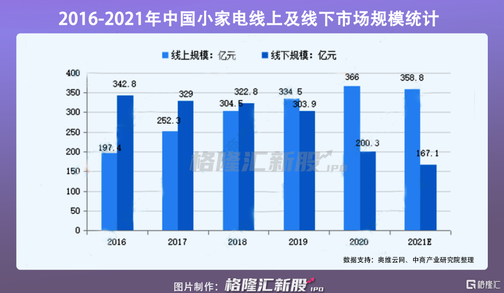 受惠於政策支持、疫情爆發催生的宅經濟紅利、線上直播刺激等推動廚類小家電需求高漲,其市場規模取得新突破,中商產業研究院數據顯示,2020年小家電線上市場規模達366億元,同比增長9.4%。