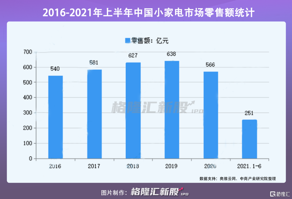 但是,隨着後疫情時代的到來,進入2021年,小家電市場出現明顯降温,行業出現平台期。奧維雲網數據顯示,今年上半年,小家電零售額共計250.8億元,同比下降8.6%;零售量11911萬台,同比下降8.2%。