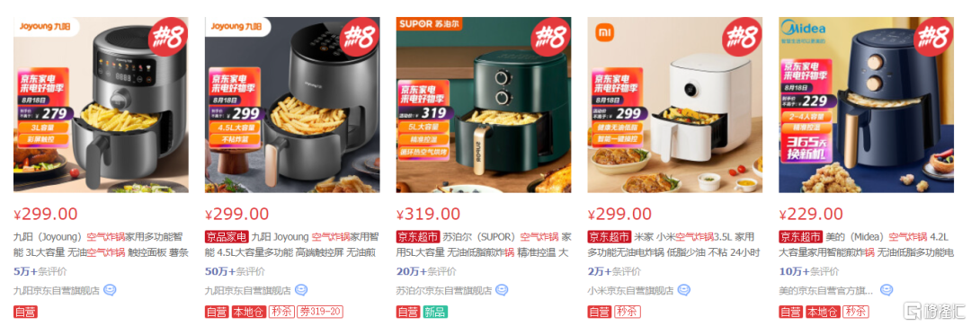 從企業數量上,據奧維雲網數據顯示,2018年 1 月至2020年 1 月期間,僅天貓旗艦店上,與空氣炸鍋相關的店鋪來看,數量有近千家,入駐的空氣炸鍋的品牌就超過100家。