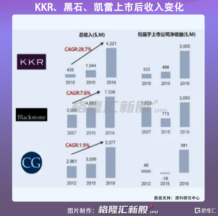 雖然TPG業務能力強勁,但其競爭壓力也不小,同業的黑石、KKR、凱雷均已上市交易。以黑石、KKR、凱雷三巨頭爲例,自上市後,總收入即歸屬上市公司淨收益實現大幅增長。TPG當前估值與三巨頭相差較大,掌管的資產,相較於黑石管理的6840億美元、KKR的4290億美元、凱雷的2760億美元,規模甚小,已經被拉開較大差距。