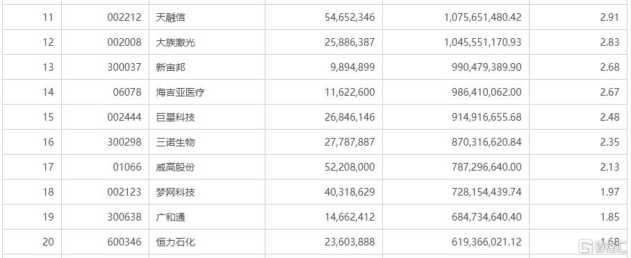 其中,天融信、大族激光、新宙邦、海吉亞醫療、巨星科技、三諾生物、威高股份的持股市值佔基金淨值比例在2%以上。夢網科技、廣和通、恆力石化則分列第18-20大重倉股。