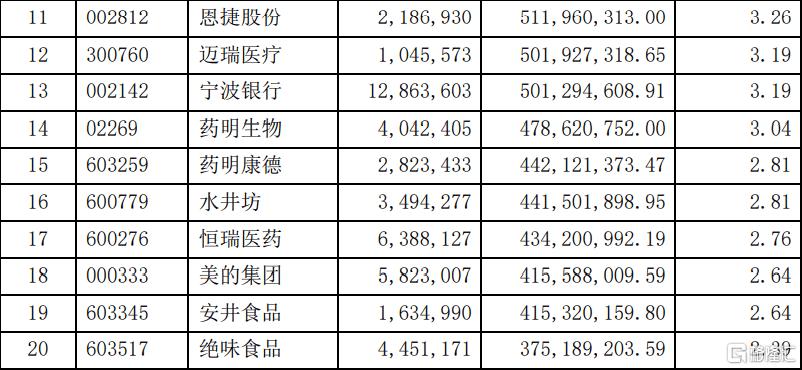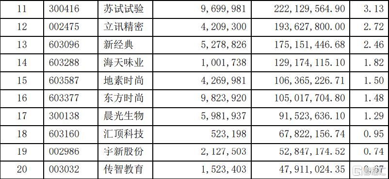 從隱形重倉股來看,蘇試試驗、立訊精密、新經典的基金持股市值佔基金淨值比在2%以上,分列第11至13位;海天味業、地素時尚、東方時尚、晨光生物、匯頂科技、宇新股份、傳智教育則分列第14至第20大重倉股。
