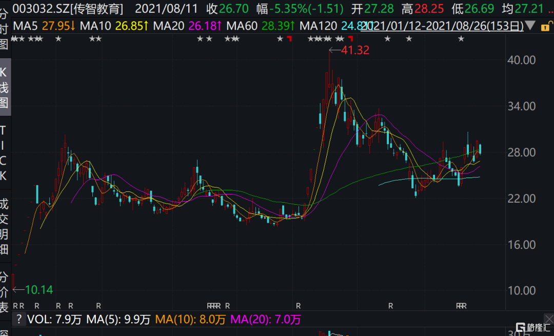 傳智教育是一家以就業為導向的職業教育機構。從半年報來看,公司上半年實現營收3.04億元,同比增15.21%;實現淨利潤0.26億元,同比增184.92%。今年上半年傳智教育漲幅達271%,7月過後教育行業迎來調整,傳智教育也一路走低,但由於主做IT教育,目前已出現止跌向上態勢。