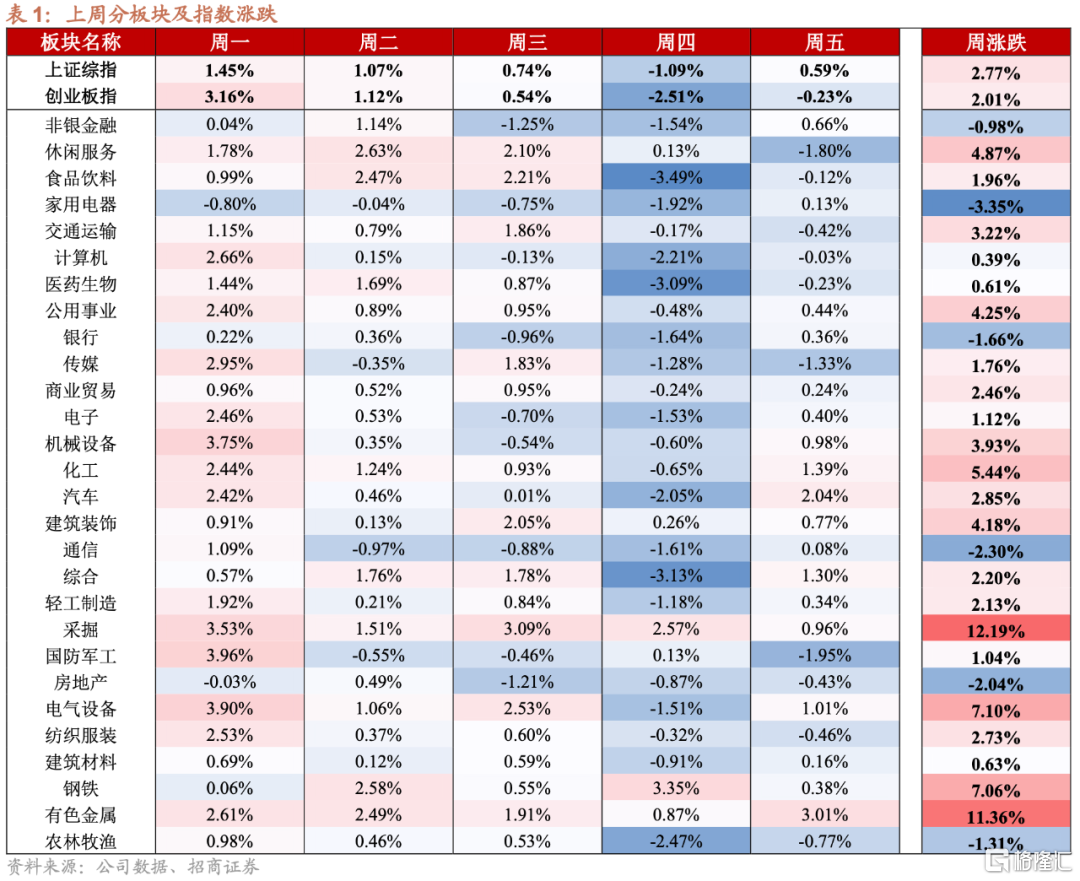 上週上證綜指、創業板指漲跌幅分別為2.77%、2.01%,近期市場波動顯著加大。週一在前期的大跌之後,市場出現顯著反彈,且以前期跌幅較深的新能源相關板塊反彈最為迅速,週二、週三行情短暫輪動至食品飲料等消費類板塊,而在週四週五市場再次出現較大幅度回調,而成交仍然保持較高水平,市場仍在反覆。分板塊來看,上週各個板塊繼續分化,採掘板塊在煤價創新高的背景下大漲超過10個點,有色金屬板塊也繼續大幅上行超過10個點,鋼鐵板塊漲幅也靠前,而家電、通信、房地產等板塊則領跌。