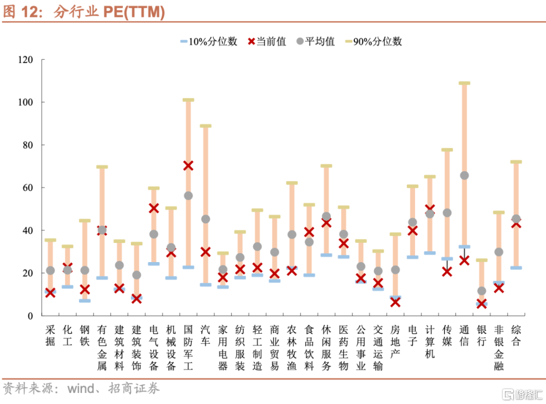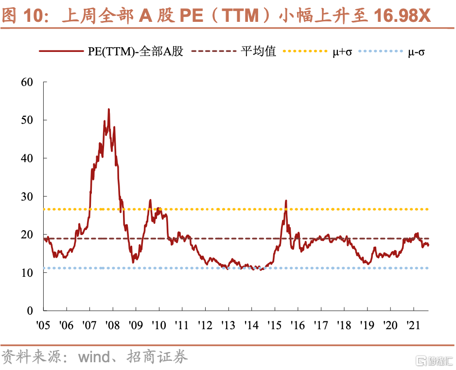 各板塊估值分化有所收斂。上週領漲的採掘、有色金屬、電氣設備估值分別變動-1.32X、0.56X、1.80X,領跌的家用電器、通信、房地產板塊估值分別回落0.82X、3.7X、0.26X,近兩週的波動中電氣設備板塊估值略有回落、但仍然處於歷史較高位置,國防軍工板塊估值仍然處於歷史均值以上,食品飲料板塊估值繼續靠近歷史均值,其餘板塊估值均未超過歷史均值,領漲的鋼鐵、有色、煤炭板塊則由於中報業績表現亮眼,估值並未顯著抬升反而有所下降。