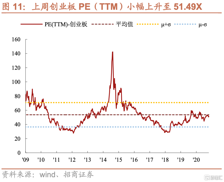 指數估值持續震盪。全部A股PE(TTM)由上週的16.92X上升至本週的16.98X,處於2005年以來歷史估值水平的46.8%分位數,全市場估值小幅回升。創業板PE(TTM)由上週的50.51X回升至51.49X,處於2009年以來歷史估值水平的52.5%分位數,創業板估值也小幅回升。