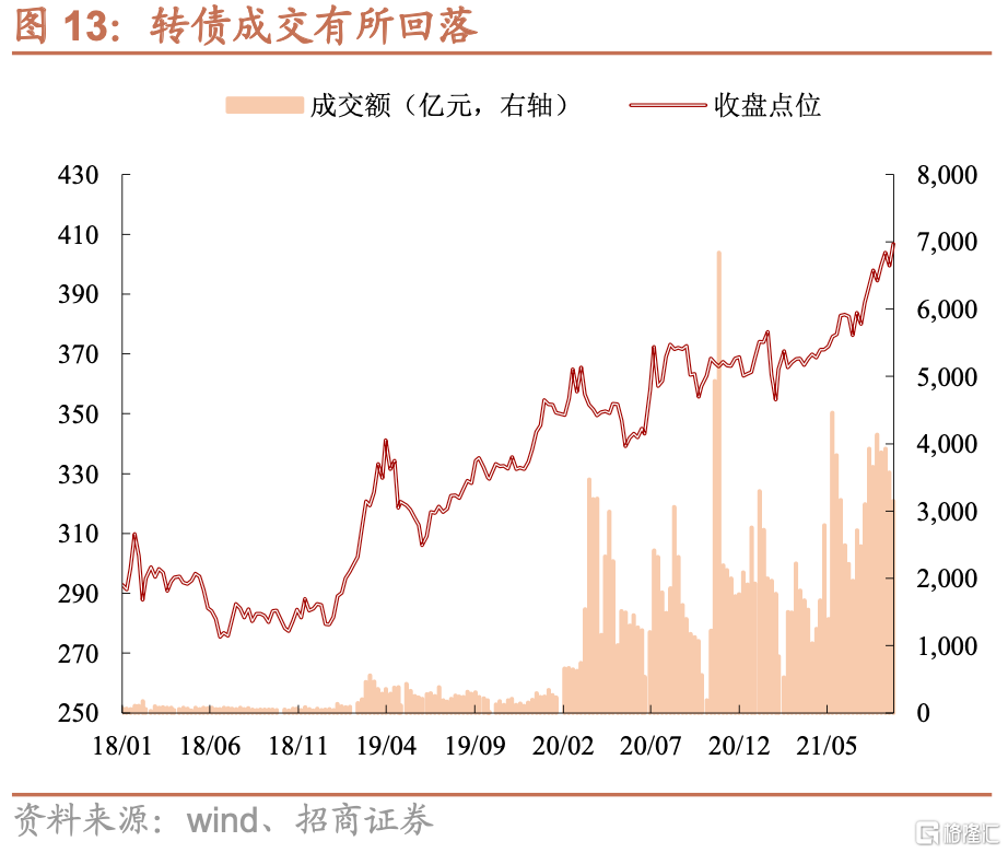 上週中證轉債指數收於406.75、上升1.82%,略低於主要股指;成交量方面,上週成交量繼續回落,日均成交量730.29億元、環比小幅回落11.82%,近期股市波動較大、但成交仍然火熱,轉債雖然成交略有回落、但也仍然維持高位。