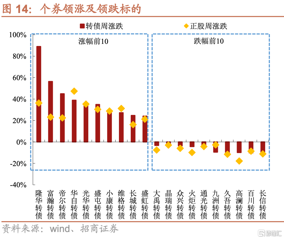 個券方面,上週隆華(89.01%)、富瀚(56.43%)、帝爾(45%)漲幅靠前,分屬公用事業、電子、機械設備行業,三隻漲幅靠前的轉債均為上週新上市轉債;長信(-10.75%)、百川(-10.25%)、高瀾(-9.81%)領跌,分別屬於電子、化工、機械設備行業,與正股走勢基本一致。