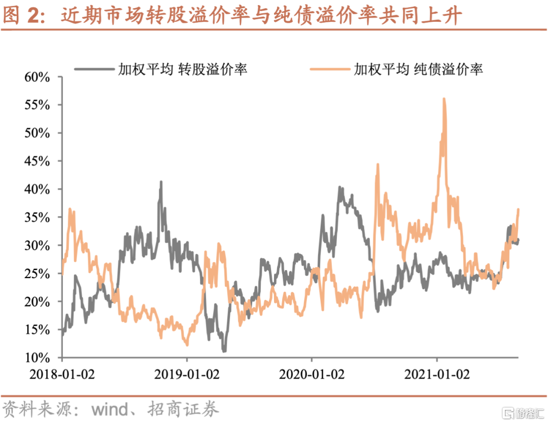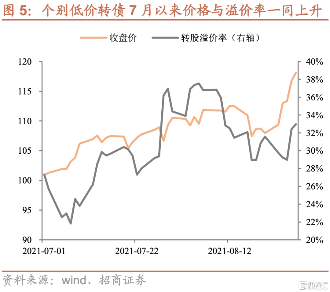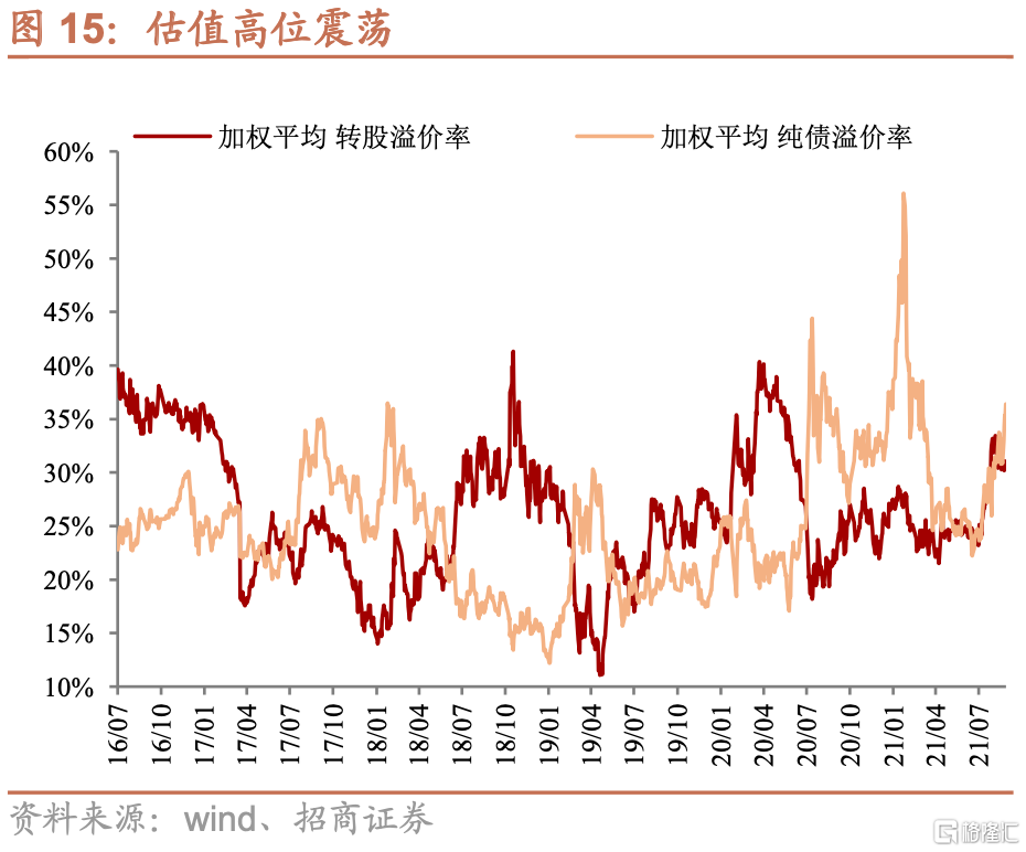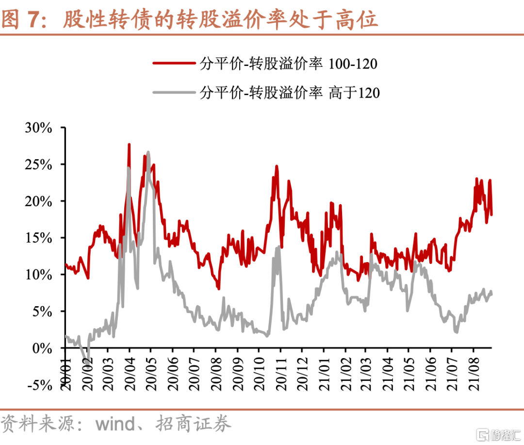 由於轉債中個券除銀行外,與股市中下盤標的重合度較高,因此轉債指數走勢與股市中小盤股票走勢基本一致,因此隨着中證1000指數創下18年以來歷史新高,轉債指數也創下歷史新高,且值得注意的是7月以來的累計漲幅與中證1000指數並未相差太多,這意味着近期轉債上漲時轉股溢價率並沒有明顯壓縮。