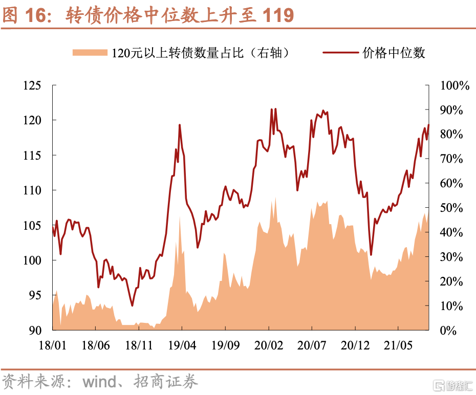 就絕對價位來看,上週可轉債收盤價中位數為119.32元,比上週繼續上漲。絕對價位在120元以上的轉債數量上升至190支、佔比接近50%。