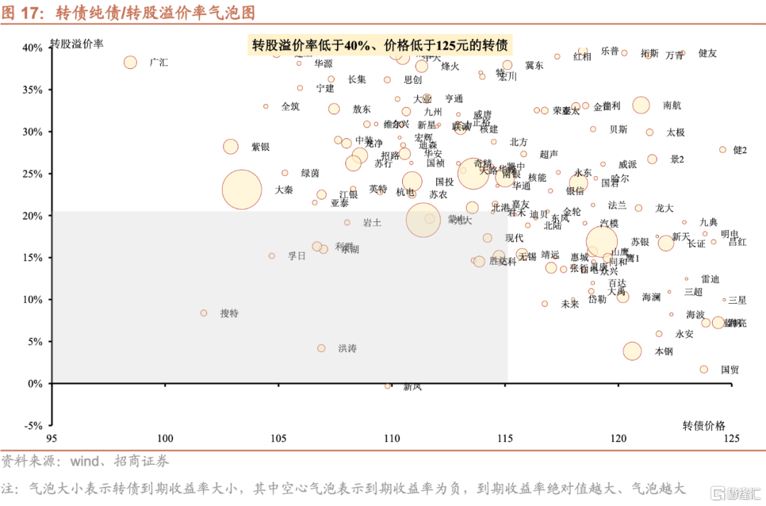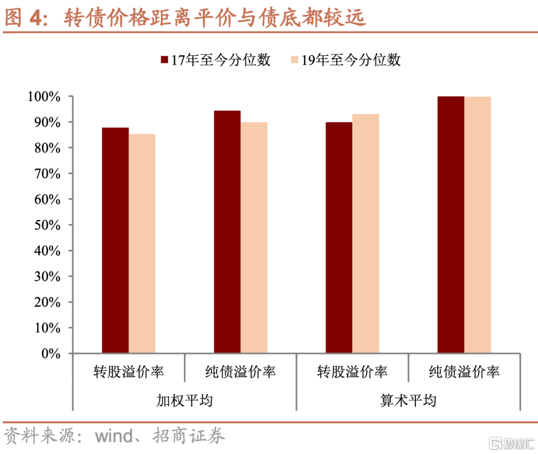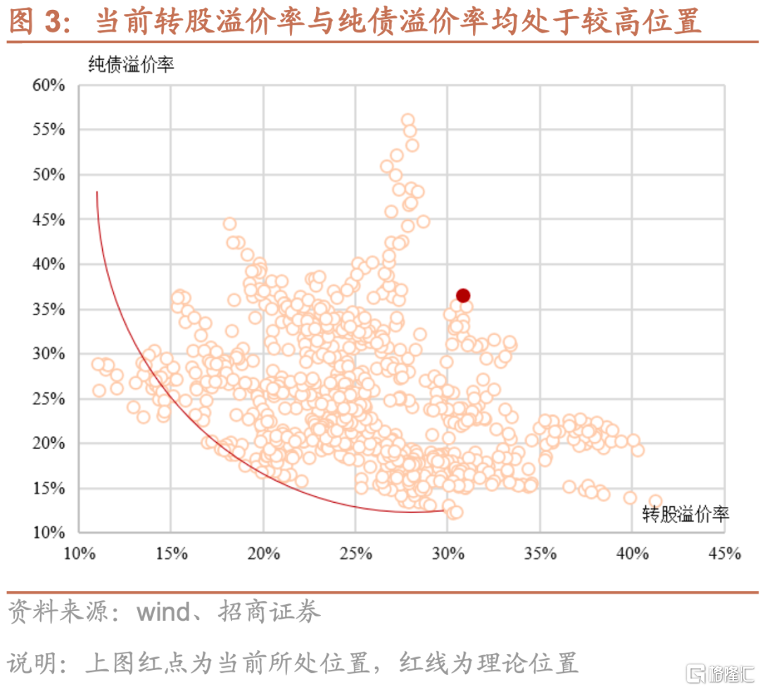 根據前文的分析理論上歷史轉股溢價率&純債溢價率的分佈應當是凸向原點的曲線,要麼兩者處於中間的位置,要麼一高一低,而從轉股溢價率與純債溢價率所處的位置來看,當前處於點陣圖的極端右上角位置,即轉股溢價率與純債溢價率雙高。
