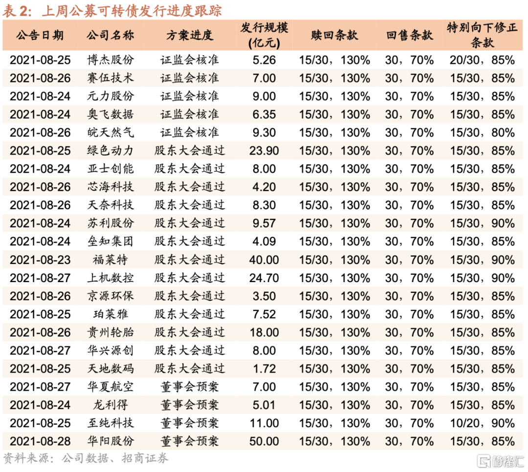 上週新增4個轉債預案,分別為華夏航空(7億元)、龍利得(5.0億元)、至純科技(11億元)、華陽股份(50億元);13家公司可轉債發行方案獲股東大會通過,為綠色動力(23.9億元)、亞士創能(8億元)、芯海科技(4.2億元)、天奈科技(8.3億元)、蘇利股份(9.57211億元)、壘知集團(4.088億元)、福萊特(40億元)、上機數控(24.7億元)、京源環保(3.5億元)、珀萊雅(7.52億元)、貴州輪胎(18億元)、華興源創(8億元)、天地數碼(1.72億元);5家公司轉債發行獲證監會核准,分別為博傑股份(5.26億元)、賽伍技術(7億元)、元力股份(9億元)、奧飛數據(6.35億元)、皖天然氣(9.3億元)。
