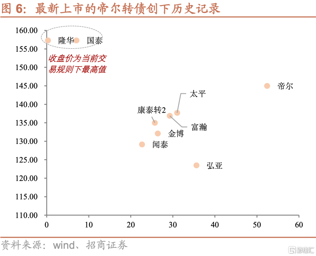 個券層面,當前高價格的轉債頂着高轉股溢價率一路創下新高;低價格的轉債在轉債價格上漲的過程中轉股溢價率不降反升,明顯拉估值。而從新券上市的角度,8月以來上市的個券中,除了觸及交易規則下收盤價上限的隆華與國泰外,其餘新券溢價率均在20%以上、價格均在120元以上,最新上市的帝爾轉債更是在平價接近100的情況下、創下50%+的溢價率,創下歷史記錄。