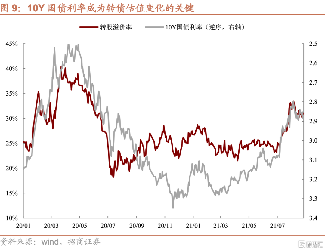 值得注意的是,在近期轉股溢價率處於極端高點的時候,與10年國債利率呈現完美的負相關關係,近期也是由於10年國債利率的小幅上行,導致轉債整體估值出現小幅回調。